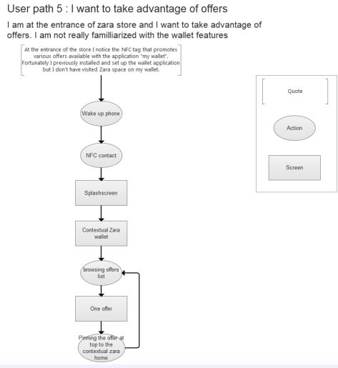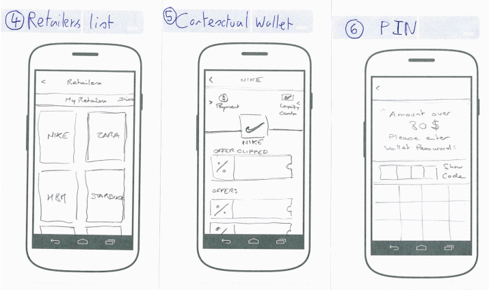The final concept “the contextual wallet” : the user “taps” the smartphone to a NFC tag at the entrance or inside a store. The layout of the home screen changes and becomes contextual to the store experience (means of payment and discount offers).